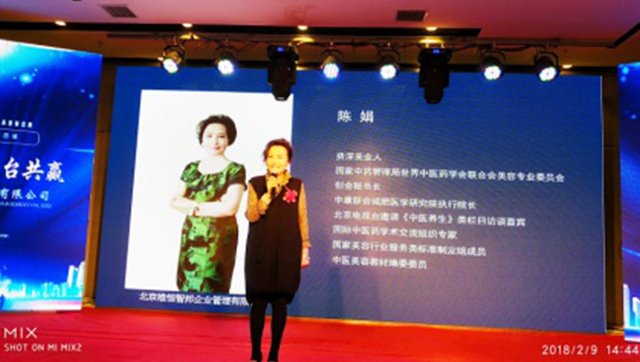 中康聯(lián)合減肥醫(yī)學研究院執(zhí)行院長陳娟女士講話:維恒智邦家人們大家好,感謝維恒智邦的三位大家長帶領數(shù)百位維恒家人,在2017年300多個日日夜夜里,為健康減肥行業(yè)做出了巨大的貢獻。維恒智邦旗下?lián)碛卸鄠€優(yōu)秀品牌,維者恒久,智以興邦,在大健康時代的背景下起到了科技領先的作用。祝賀中康聯(lián)合減肥醫(yī)學研究院太原分院成立,同時,作為中康聯(lián)合減肥醫(yī)學研究院太原分院將不負使命,攜手國際國內(nèi)的科研團隊,為養(yǎng)生美容品牌保駕護航,我們堅信維恒智邦將會更加絢麗多彩。最后預祝維恒集團本次年會圓滿成功,祝福維恒集團2018年高歌猛進,再創(chuàng)佳績共創(chuàng)輝煌。